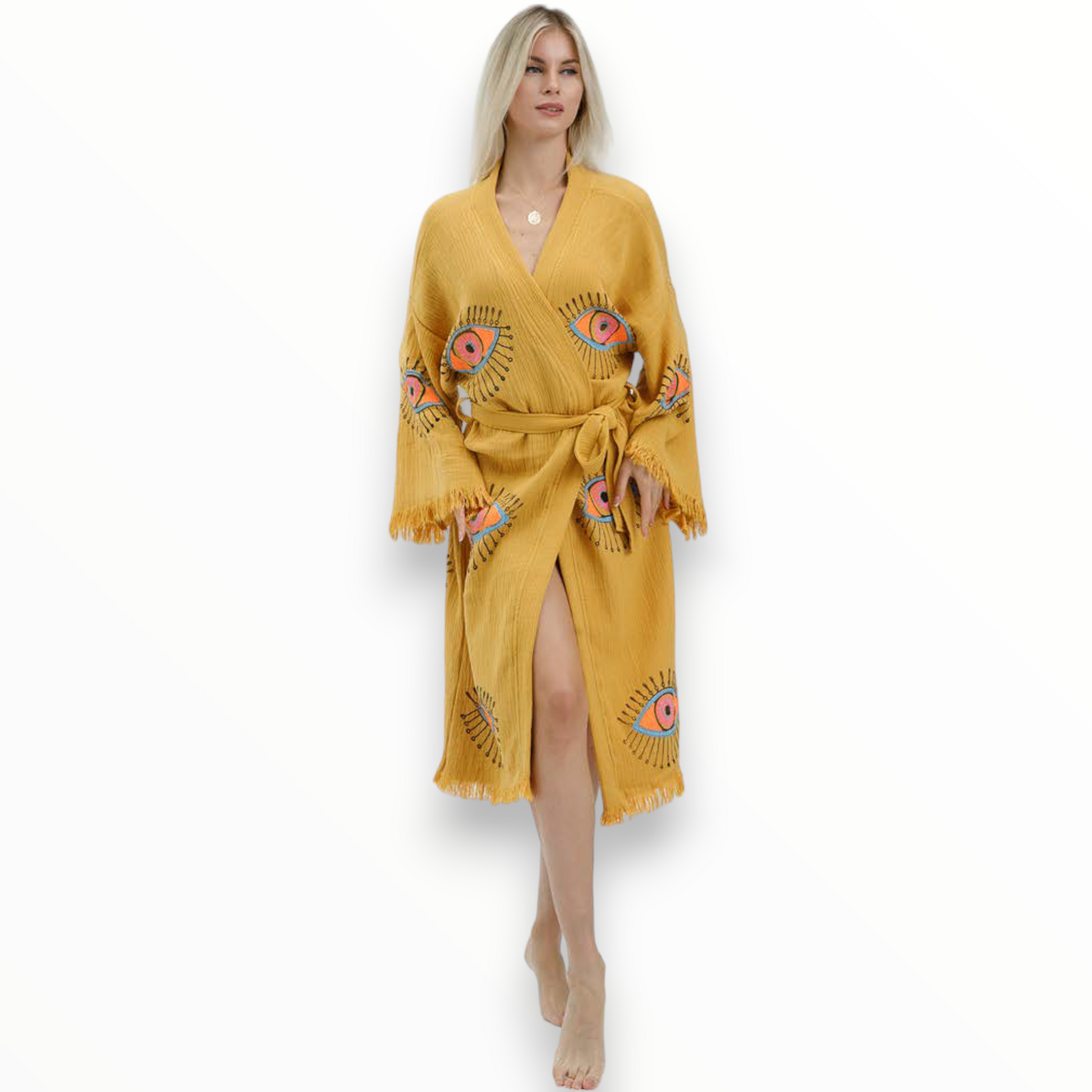 El Dokuma Doğal Pamuk Kumaş üzerine El Boyama, Nazar Boncuk desenli Kimono.